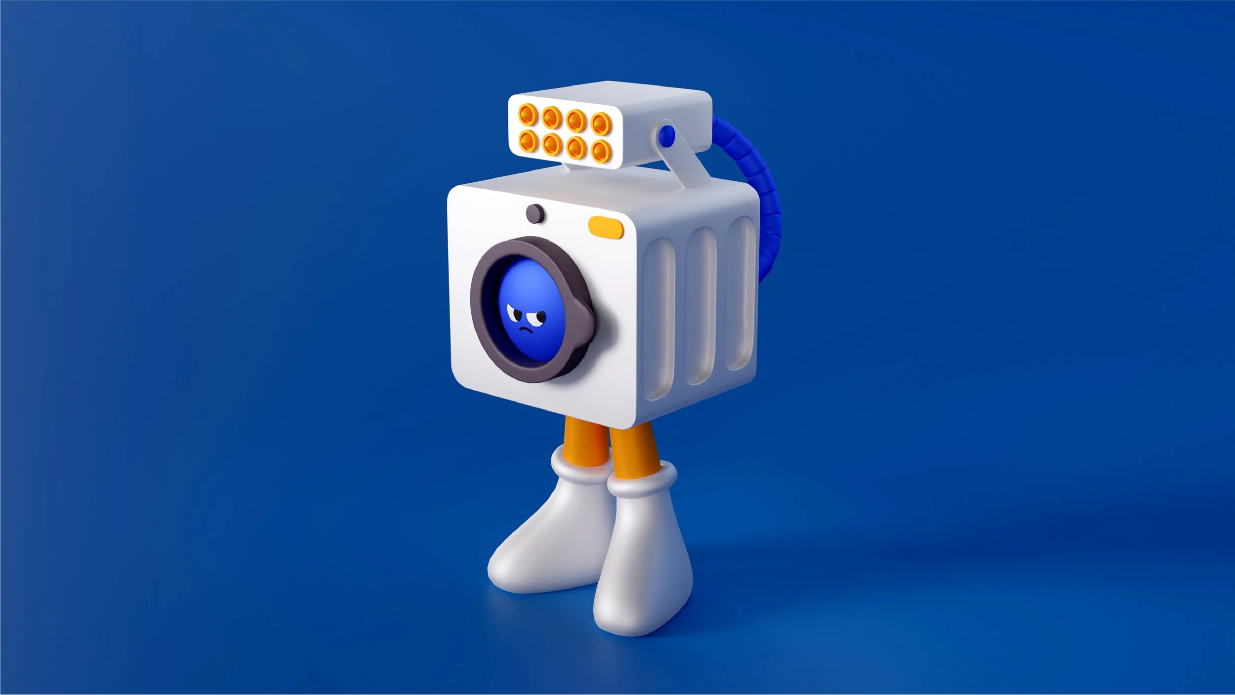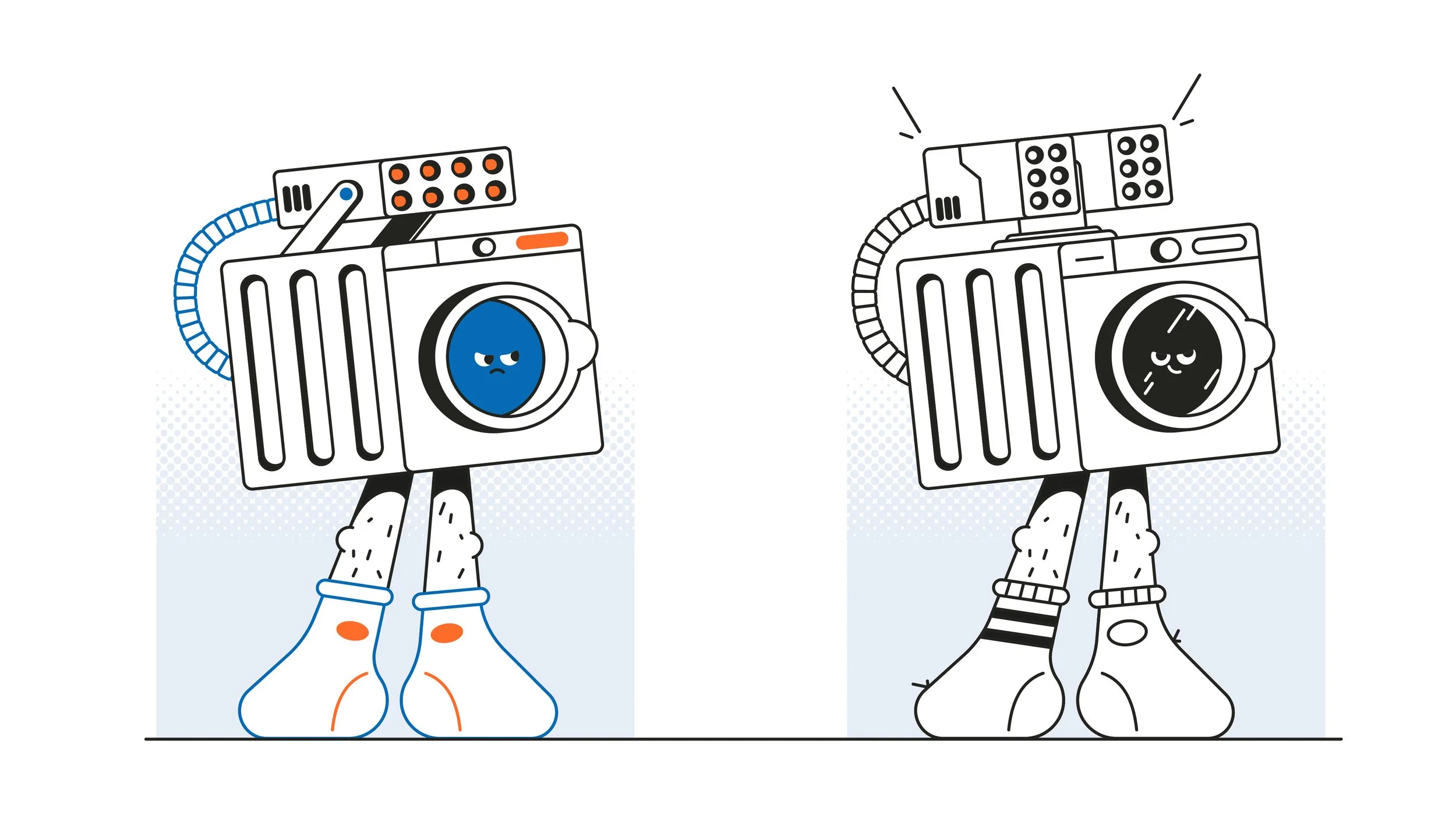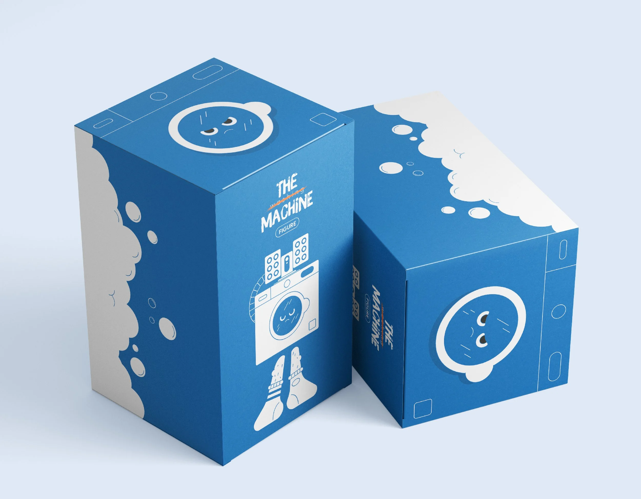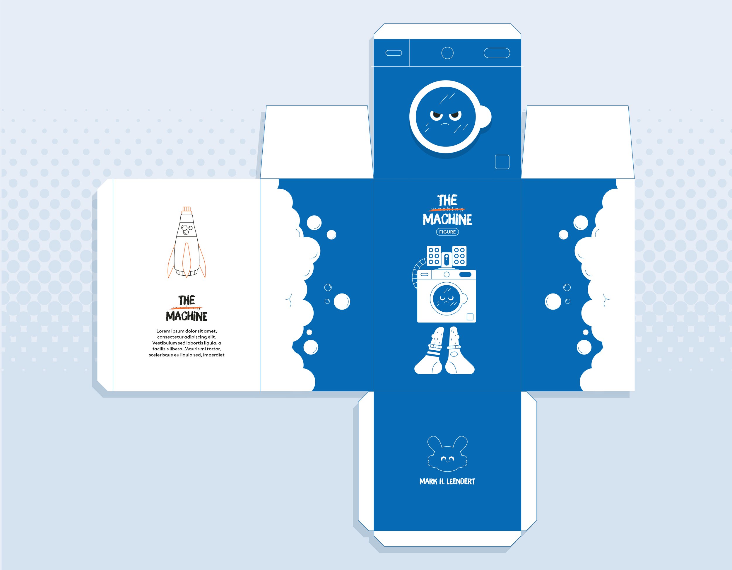 Since washing machines have a reputation for making socks disappear, I gave the character two different socks. Which might explain the angry expression. Later, I added the missing sock stuck to the back as a playful detail.